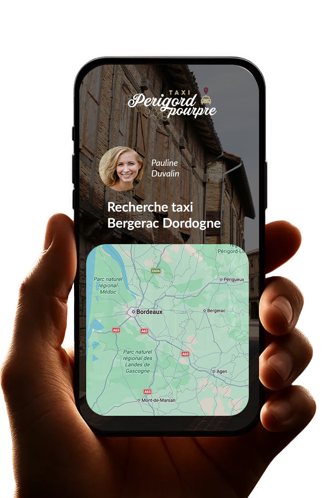 Basé à Saint-Laurent-des-Vignes (24130), à 6 km de Bergerac, Taxi Périgord Pourpre dessert l’ensemble du département de la Dordogne (24) et toute la région Nouvelle-Aquitaine. Nos tarifs incluent toutes distances, de la course locale à Bergerac jusqu’aux grands trajets vers Bordeaux, Toulouse, Limoges ou Paris. English spoken — we welcome British and international visitors to the Périgord.